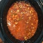 Brown the meat with the onions and garlic. Season the meat with some salt and pepper and chili seasoning. Once that is browned and drained if necessary, transfer to the crockpot.